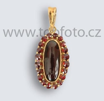 Nádherný oválny prívesok s českým granátom a almandínovým okom v strede. Krásna práca, vhodná ako zaujímavý a cenný dar pre všetky vekové kategórie žien, na výročie, darček pre mamu alebo napríklad ako dar pre starú mamu.