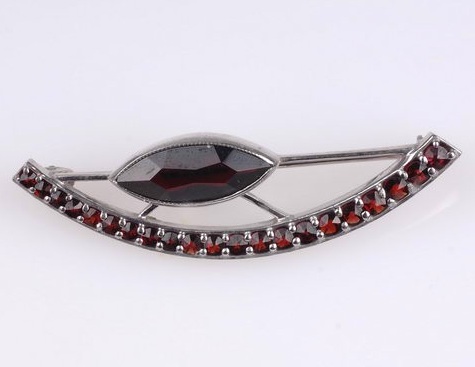 Ozdobná člnková strieborná brošňa s českým granátom a veľkým almandínovým okom.