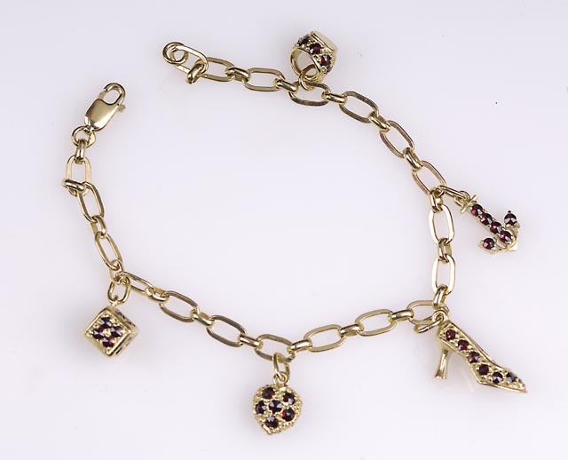Krásne prepracovaný pozlátený náramok tvarovo zložený z malých príveskov - lodička, srdce, kotva, košík, kocka, uložených na náramku. Je vhodný na nosenie k zlatým šperkom. Hodí sa pre mladé slečny, ako aj pre ženy rôznych vekových kategórii. Pôsobí omladzujúco, milo a zaujímavo. Bude príjemným darčekom a poteší pri každej príležitosti.