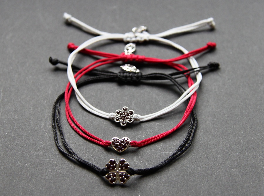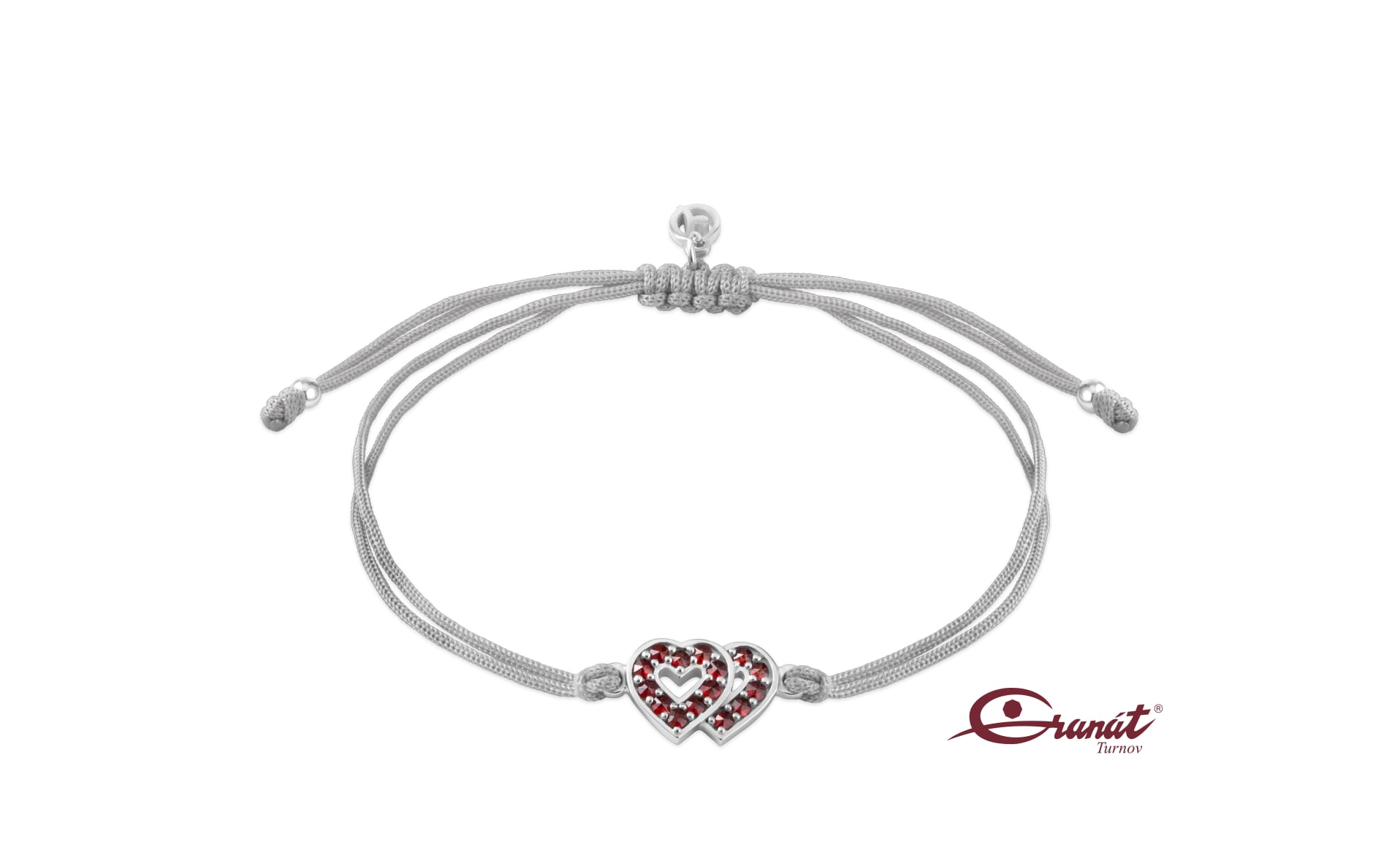 Moderný šnúrkový náramok s českými granátmi so vzorom spojených sŕdc. Je vhodný ako štýlový darček k sviatku. Určite poteší. Vyznačuje sa pohodlným nosením. Veľkosť náramku sa ľahko nastavuje. Pekne vyzerá na ruke samostatne, ale aj spolu s ďalšími náramkami.