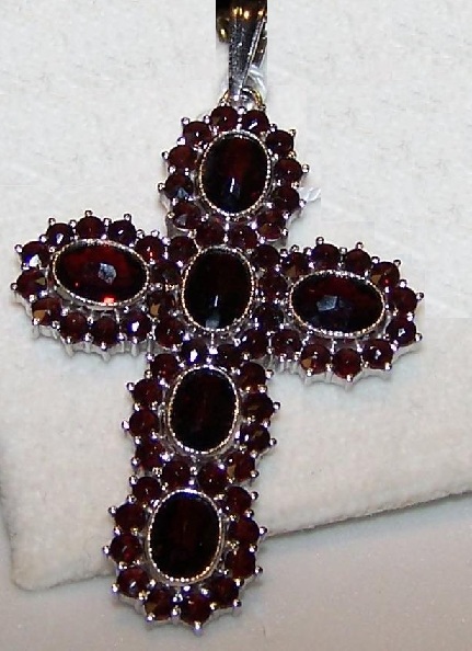 Mohutnejší, krásny prívesok v tvare krížika s českými granátmi a almandínmi. Veľmi drahý, majstrovsky prepracovaný a cenný kúsok do vašej klenotnice. Je vhodný ako drahý dar na významné príležitosti, napr. ako dar na svadbu.