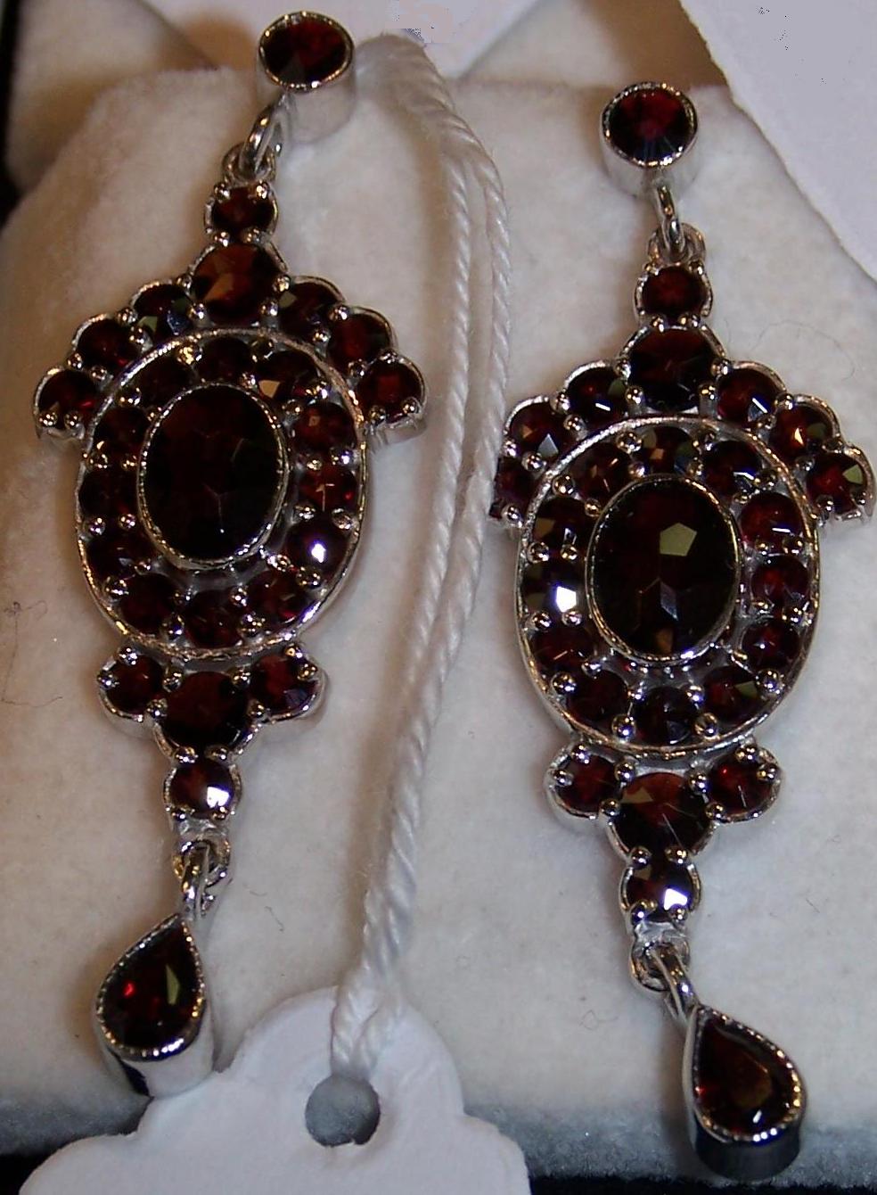 Krásne, elegantné, luxusné visiace náušnice s českým granátom a náročným dizajnom. Ručne brúsené polodrahokami a zložité dizajnové prevedenie bude cennou súčasťou každej šperkovnice. Sú výrazné, hodia sa k všetkým vekovým kategóriam a odporúčajú sa nosiť na významné príležitosti. Osviežia vzhľah každej ženy. Sú vhodné ako hodnotný darček na významnú príležitosť, na výročie pre ženu alebo ako dar k narodeninám.  Sú dobre nositeľné a kombinovateľné s inými šperkami.