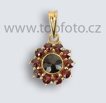 Krásny pozlátený prívesok s granátom tradičného kvetovaného vzoru. Vhodný ako zaujímavý a cenný dar na výročie pre ženu, darček pre mamu alebo napríklad ako dar pre starú mamu.