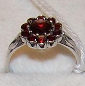 Nádherný prsteň z českého granátu tradičného kvetovaného dizajnu. Je vytvorený z ručne brúsených kameňov českého granátu, ktoré obkolesujú do stredu zasadený almandín. Tento krásne prepracovaný šperk je vhodný pre každú ženu, najmä ako darček na výročie, darček pre mamu alebo aj ako dar na narodeniny.